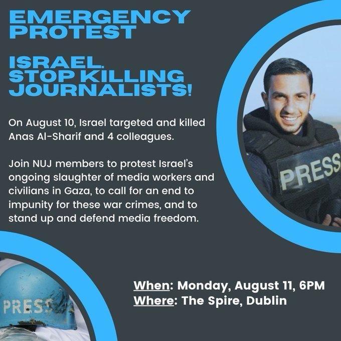 Event poster: EMERGENCY PROTEST ISRAEL: STOP KILLING JOURNALISTS Monday, 11 August 2025 at 6pm The Spire, Dublin 1. On 10 August 2025, Israel targeted and killed Anas Al-Sharif and four colleagues. Join NUJ members to protest Israel's ongoing slaughter of media workers and civilians in Gaza, to call for an end to impunity for these war crimes, and to stand up and defend media freedom.