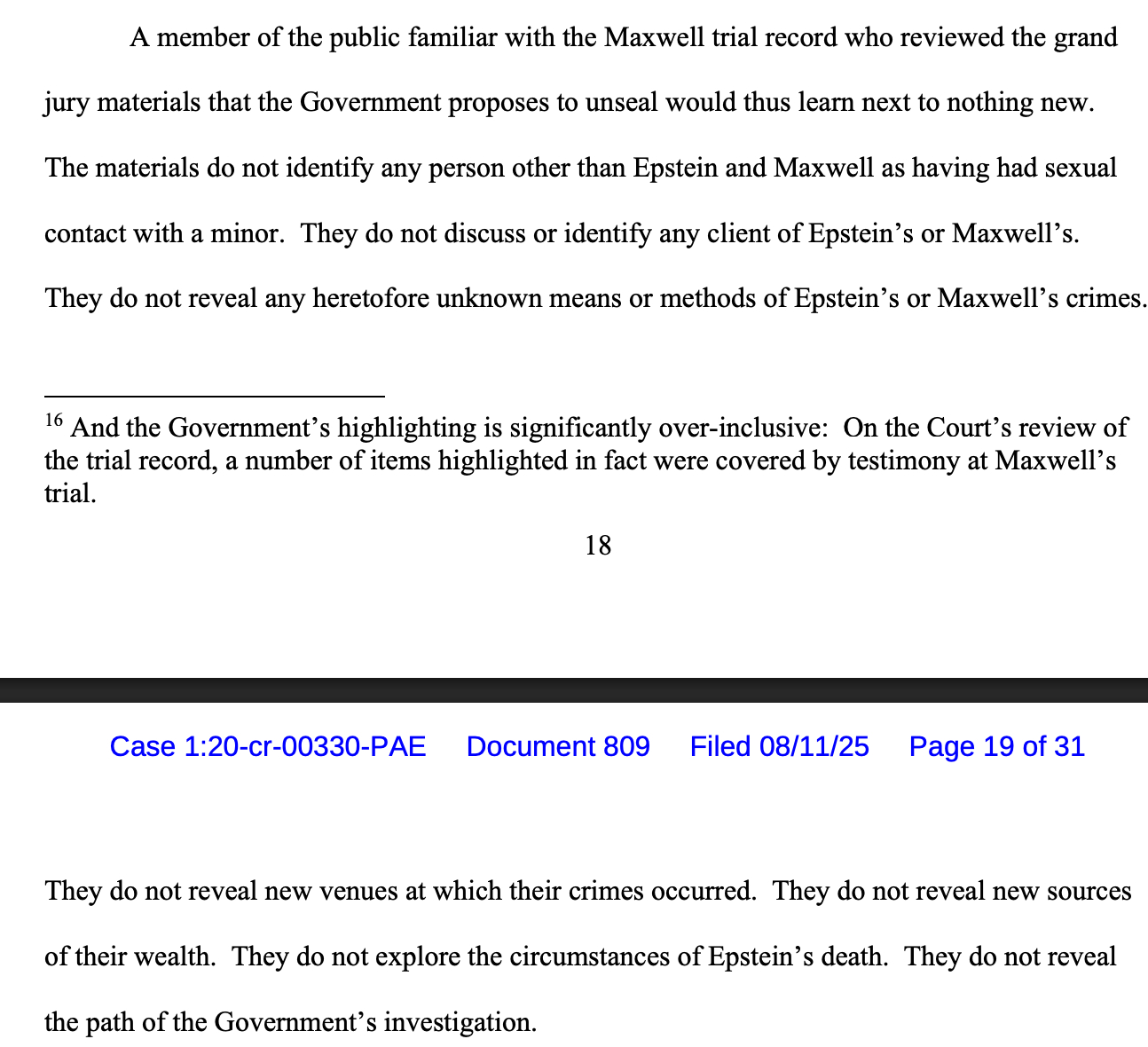 A member of the public familiar with the Maxwell trial record who reviewed the grand jury materials that the Government proposes to unseal would thus learn next to nothing new. The materials do not identify any person other than Epstein and Maxwell as having had sexual contact with a minor. They do not discuss or identify any client of Epstein’s or Maxwell’s. They do not reveal any heretofore unknown means or methods of Epstein’s or Maxwell’s crimes. They do not reveal new venues at which their crimes occurred. They do not reveal new sources of their wealth. They do not explore the circumstances of Epstein’s death. They do not reveal the path of the Government’s investigation.
