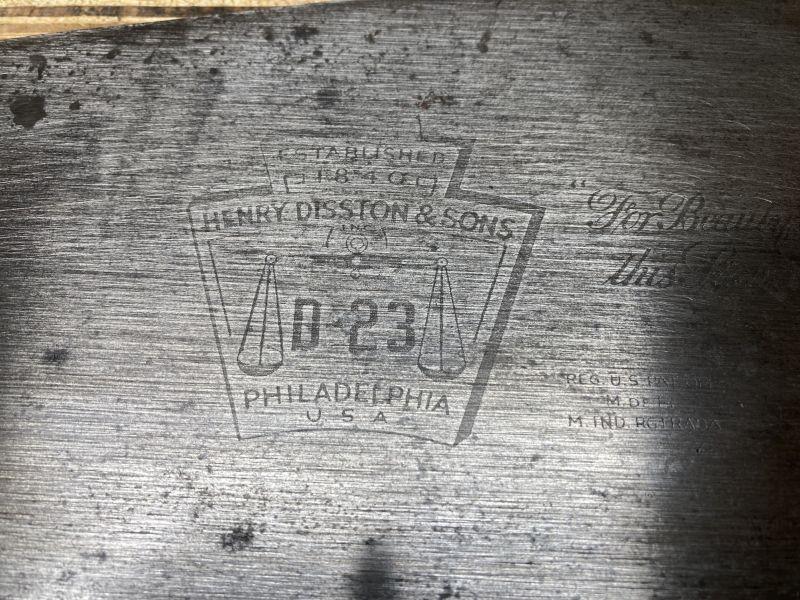 Manufacturer's logo etched on the metal plate of an old handsaw. The etching is darker gray against the silver gray unetched plate. The plate has a brushed steel or satin texture. There are some darker spots on the metal. The logo is a keystone with a 2 pan balance scale in the middle. Text in the top part of the keystone reads "ESTABLISHED 1840". Below that is the company name "HENRY DISSTON & SONS" Between the pans of the balance scale is the saw model number: "D-23". At the bottom of the keystone is "PHILADELPHIA U S A".