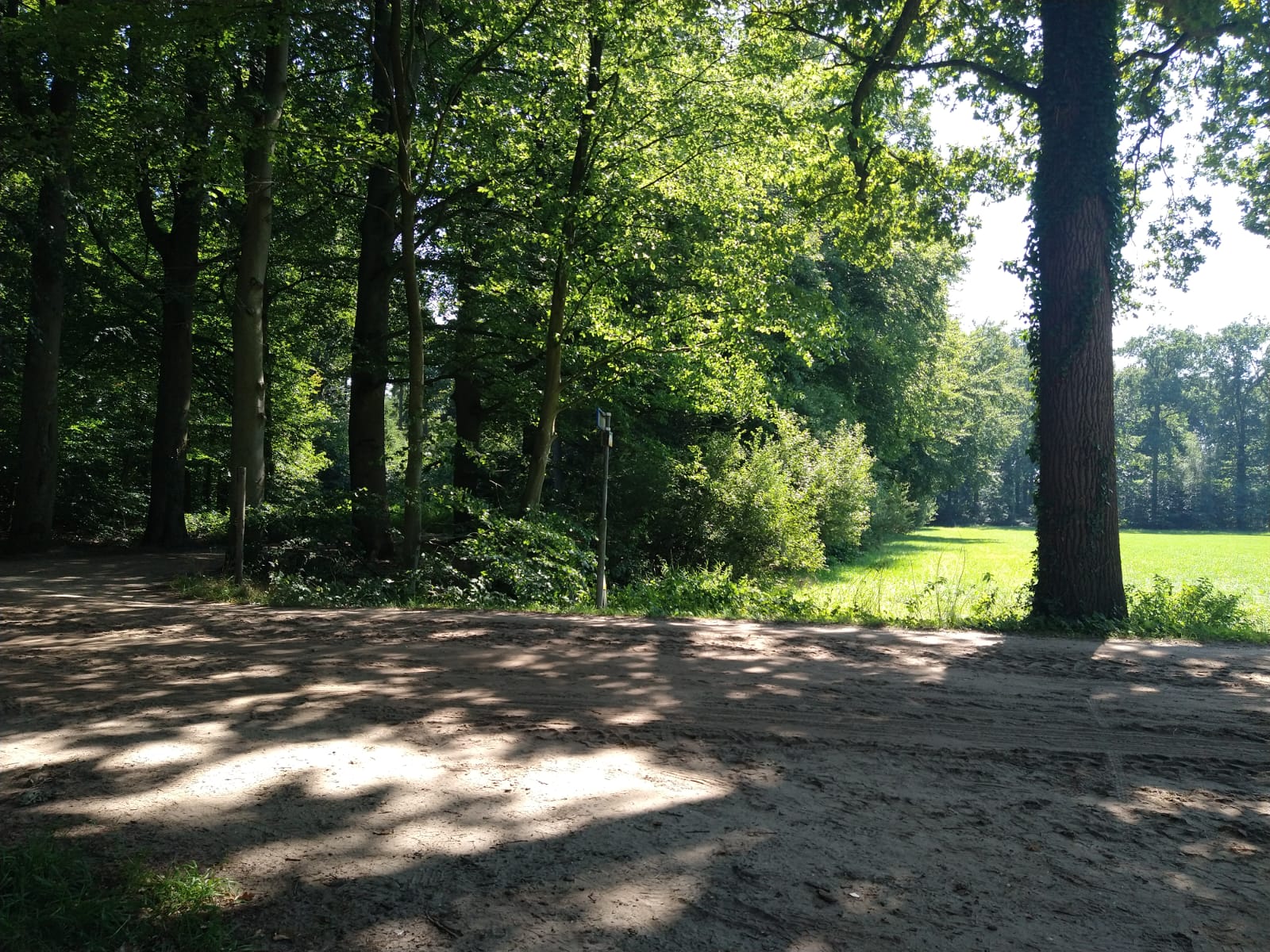 The view from the pauzebankje, painting a pretty average picture of this leg: on the right, an open field of grass as part of agriculture, brightly lit by the sun. On the left a more wooded area providing much more shade. In the foreground, from left to right, there is a sandy path which has dappled shade tha ks to the trees lining it.