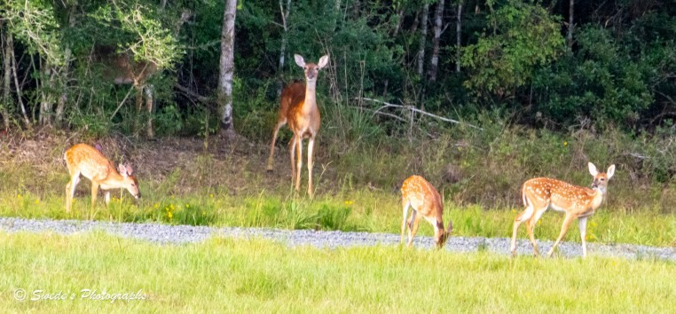 "In the soft hush of morning, a doe stands sentinel in a clearing bathed in gentle light. Her posture is alert but calm—ears pricked, eyes scanning the horizon with quiet vigilance. She is the embodiment of grace and guardianship, her tawny coat blending seamlessly with the summer grass. Around her, three fawns move with tentative joy, their small bodies dappled in white polka dots like scattered petals on a forest floor. Each spot catches the light, giving their fur a delicate shimmer as they nibble at the dew-laced grass. Their movements are gentle, almost playful—heads bobbing, legs slightly unsure, as if the world is still new beneath their hooves. The fawns stay close, orbiting their mother like stars around a steady moon. She doesn’t feed; she watches. Her stillness is protective, a living shield against the unseen. The scene feels sacred—an intimate moment of trust and survival, framed by the quiet rhythm of nature waking up. There’s no urgency, no fear—just the soft choreography of life unfolding in the wild." - Copilot