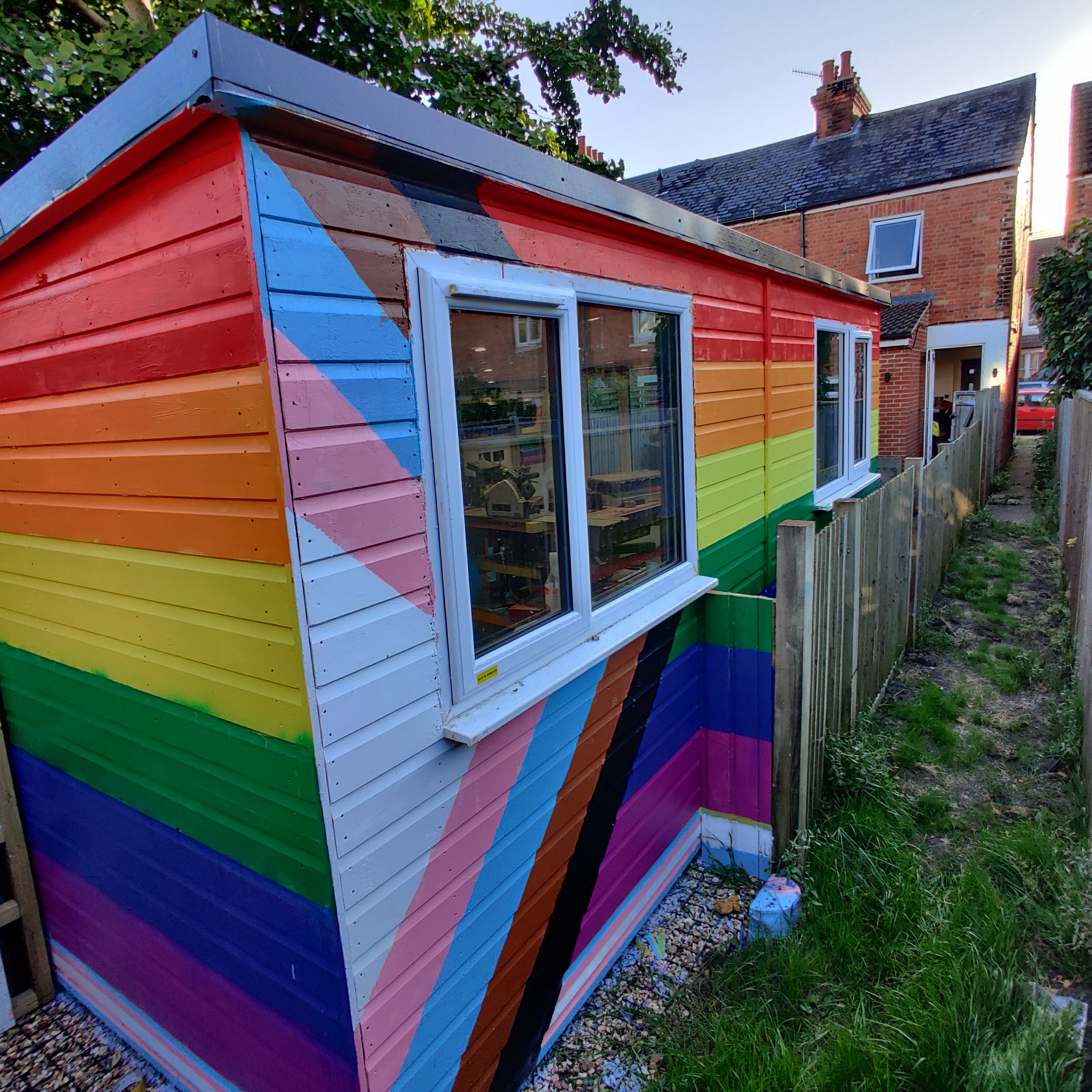 The Progress Pride Flag, painted on a wooden shed, The Shed features UPVC Triple Glazed Windows