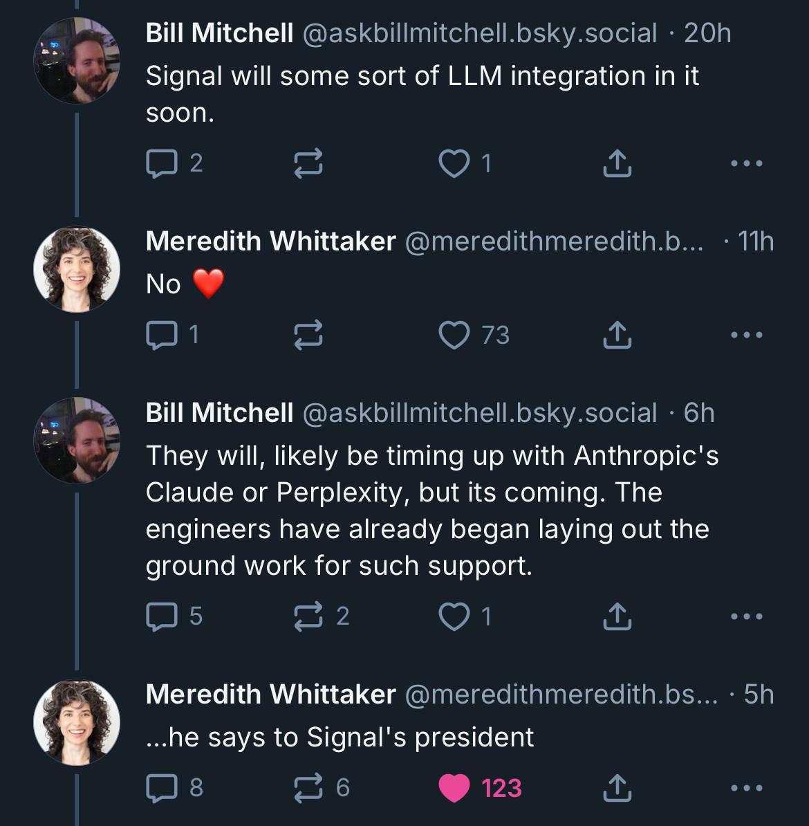Screenshot of a conversation on Bluesky: Bill Mitchell (@askbillmitchell.bsky.social · 20h): “Signal will some sort of LLM integration in it soon.” Meredith Whittaker (@meredithmeredith.bsky.social · 11h): “No ❤️” Bill Mitchell (@askbillmitchell.bsky.social · 6h): “They will, likely be timing up with Anthropic's Claude or Perplexity, but its coming. The engineers have already began laying out the ground work for such support.” Meredith Whittaker (@meredithmeredith.bsky.social · 5h): “…he says to Signal's president”