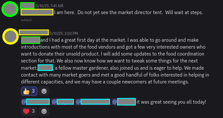 Screenshot of chat that reads: Redacted and I had a great first day at the market. I was able to go around and make introductions with most of the food vendors and got a few very interested owners who want to donate their unsold product. I will add some updates to the food coordination section for that. We also now know how we want to tweak some things for the next market. Another Redacted, a fellow master gardener, also joined us and is eager to help. We made contact with many market goers and met a good handful of folks interested in helping in different capacities, and we may have a couple newcomers at future meetings.