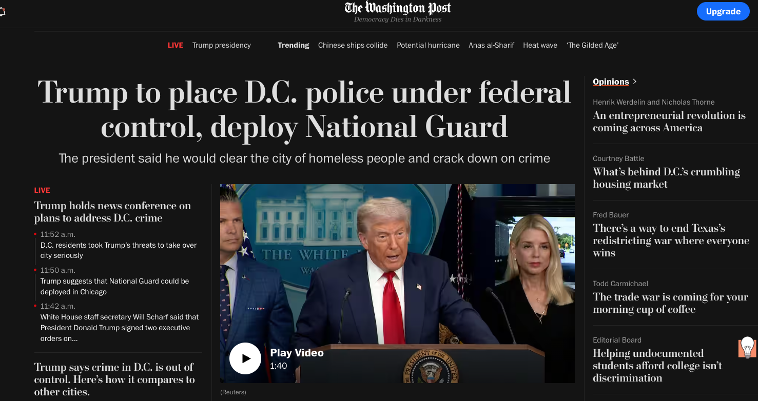 A three-column headline spans the top of the Washington Post today: "Trump to place D.C. police under federal control, deploy National Guard." Subheads say: Trump suggests that National Guard could be deployed in Chicago." At the center of the page is a photo of Trump at a recent White House press conference announcing the move.