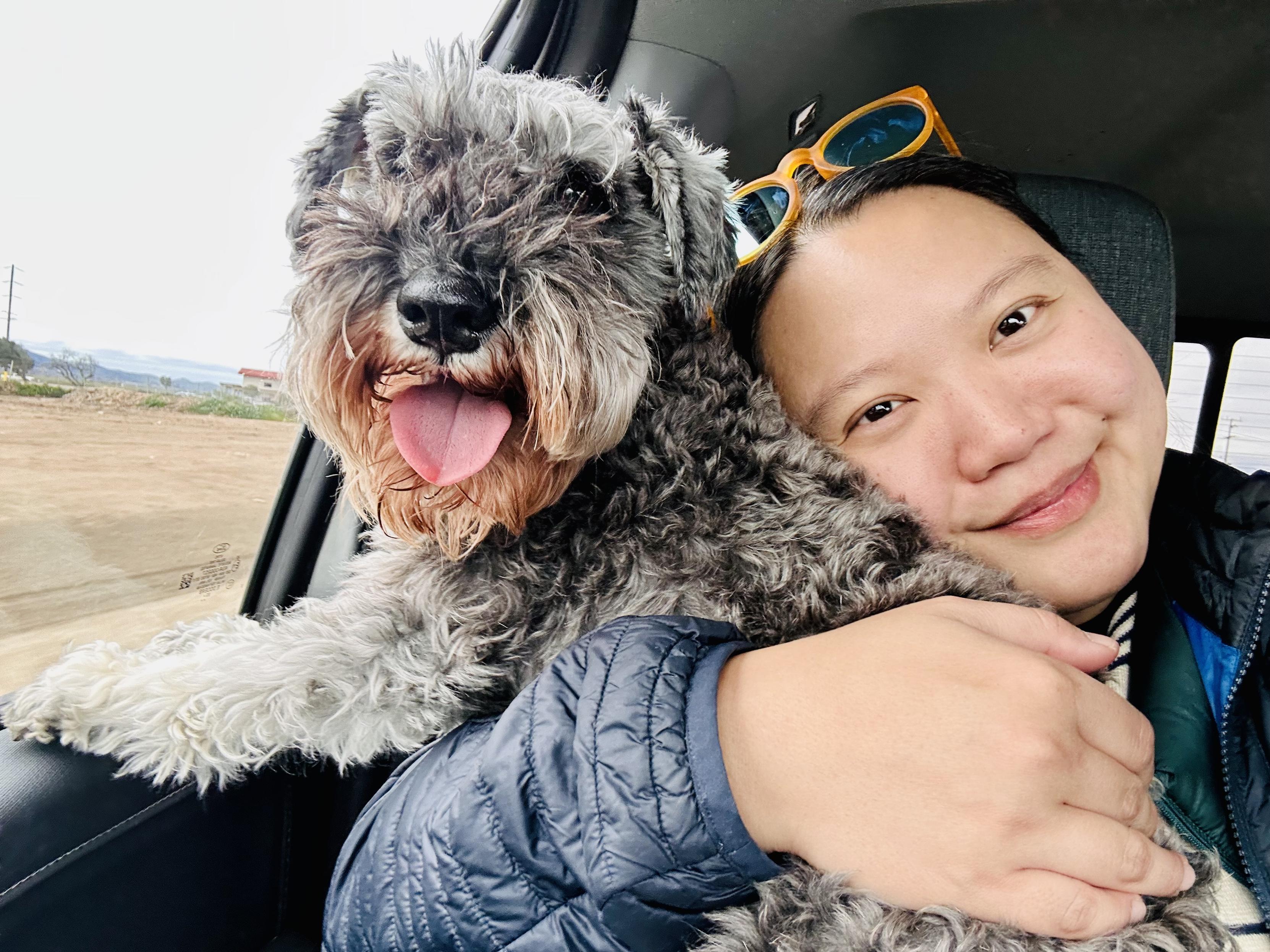 Selfie of an Asian person in a car holding a schnauzer dog, who is beaming widely