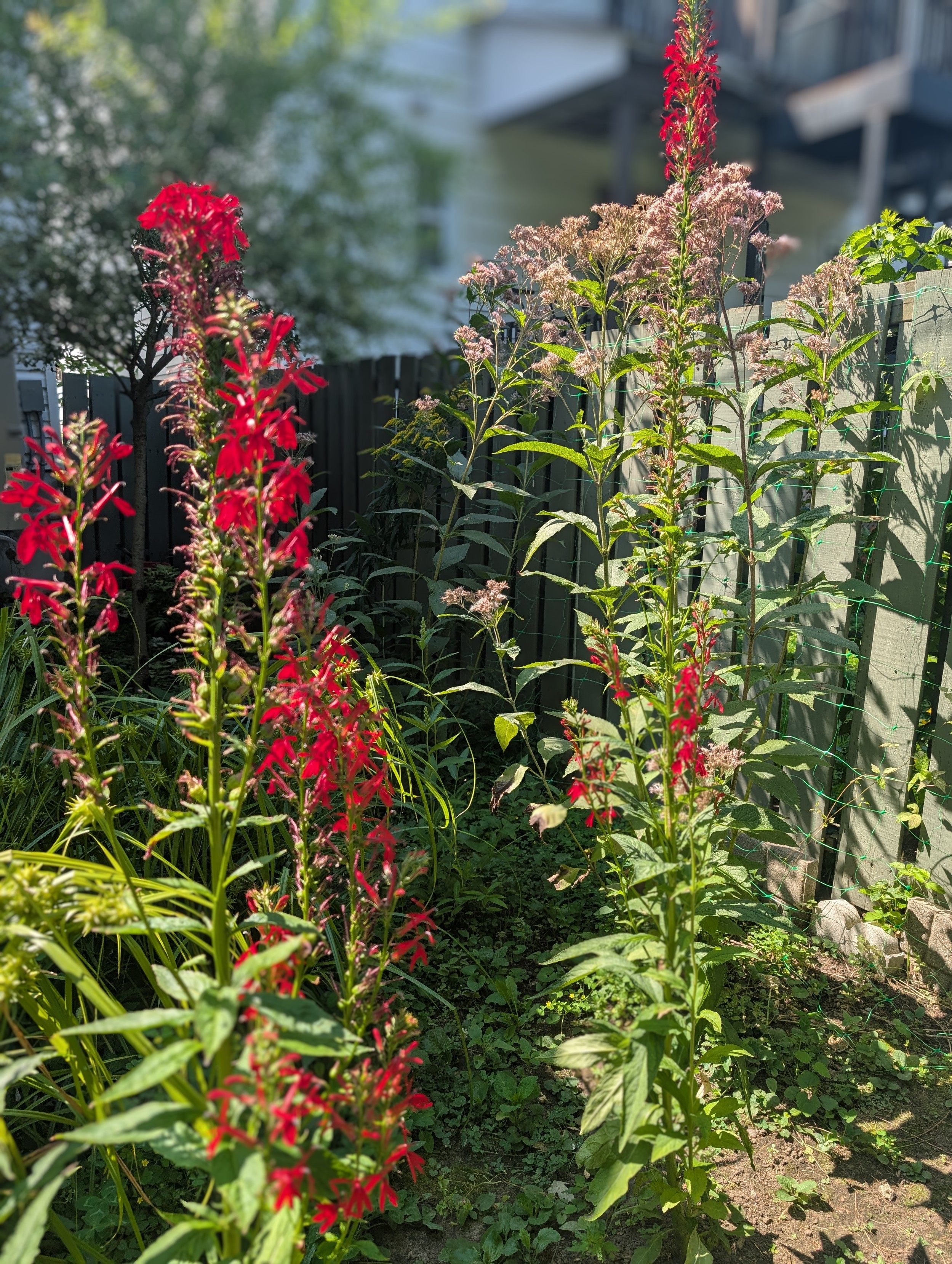 Multiple tall stems of red tubular flowers in front of tall stems of pink frilly blooms, all in front of a wooden fence