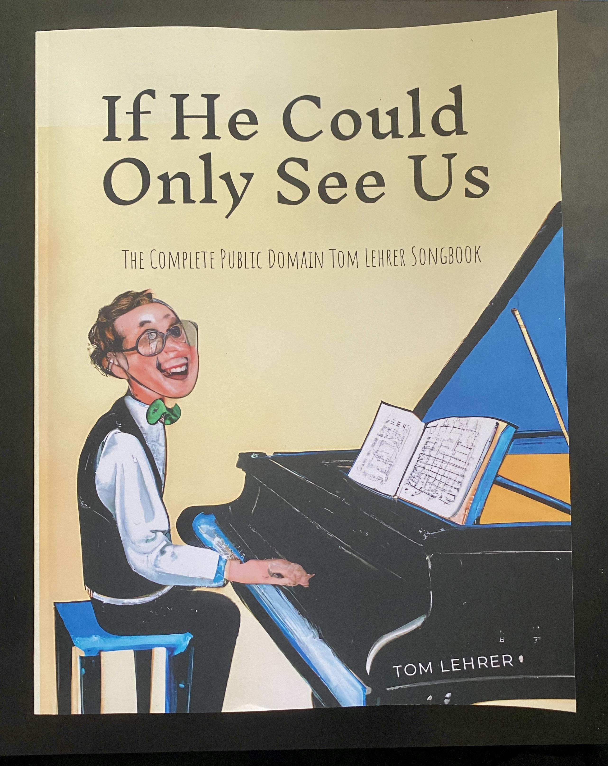 Tom Lehrer -nuottikirjan ”If He Could Only See Us” kansi. Kuvassa käppäinen tekoälynäkemys flyygelin äärellä laulavasta ja soittavasta Tom Lehreristä (oletan), hailakankeltainen tausta.