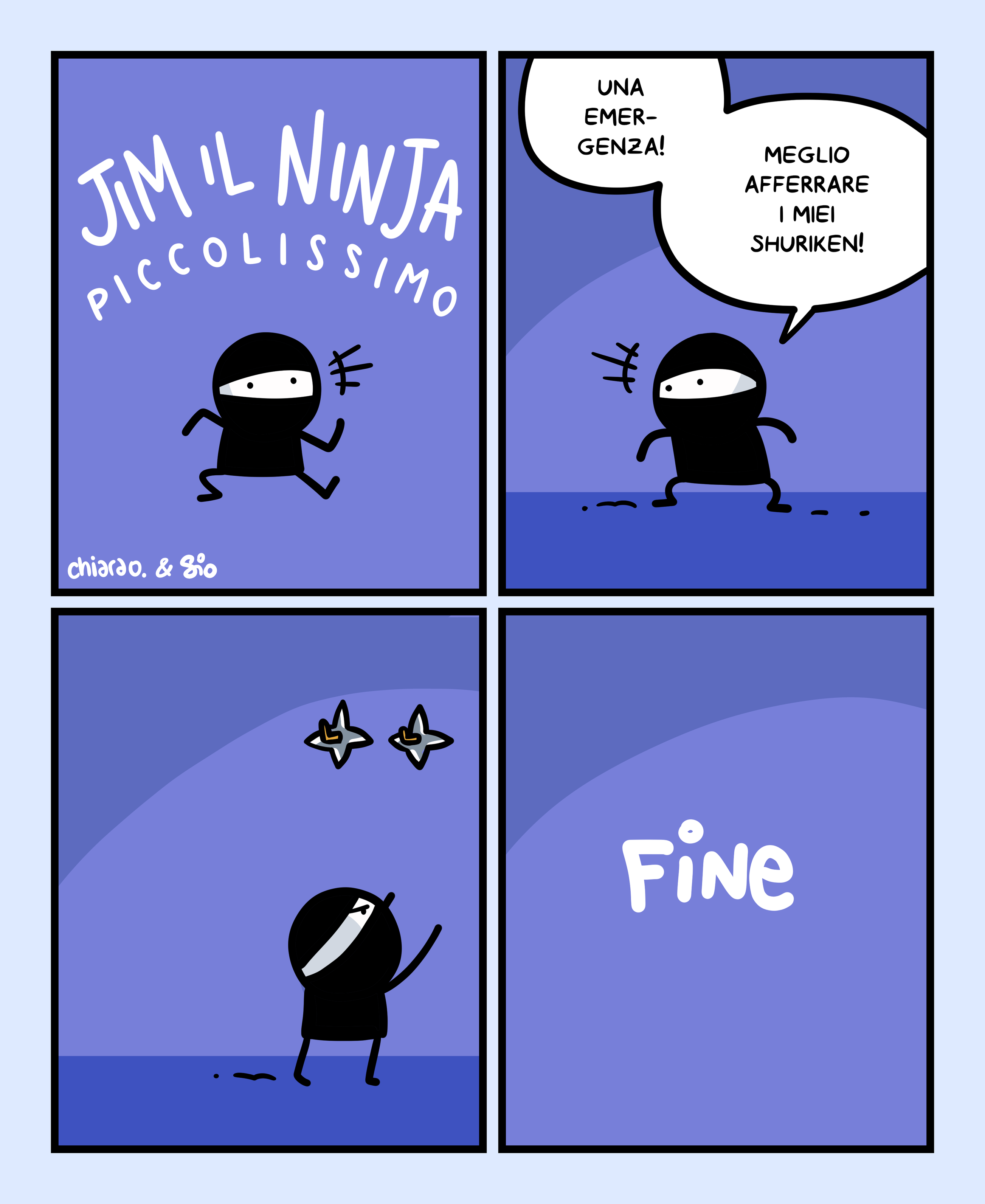 1 Titolo vignetta: Jim il ninja piccolissimo. Vediamo un piccolo ninja tutto vestito di nero. 2 Il piccolo ninja Jim dice: βUna emergenza! Meglio afferrare i miei shuriken!" 3 Vediamo il piccolo Ninja Jim che alza le mani e si sforza per prendere i suoi shuriken appesi al muro, ma sono appesi troppo in alto e lui Γ¨ troppo piccolo. Non ci arriva. 4 FINE