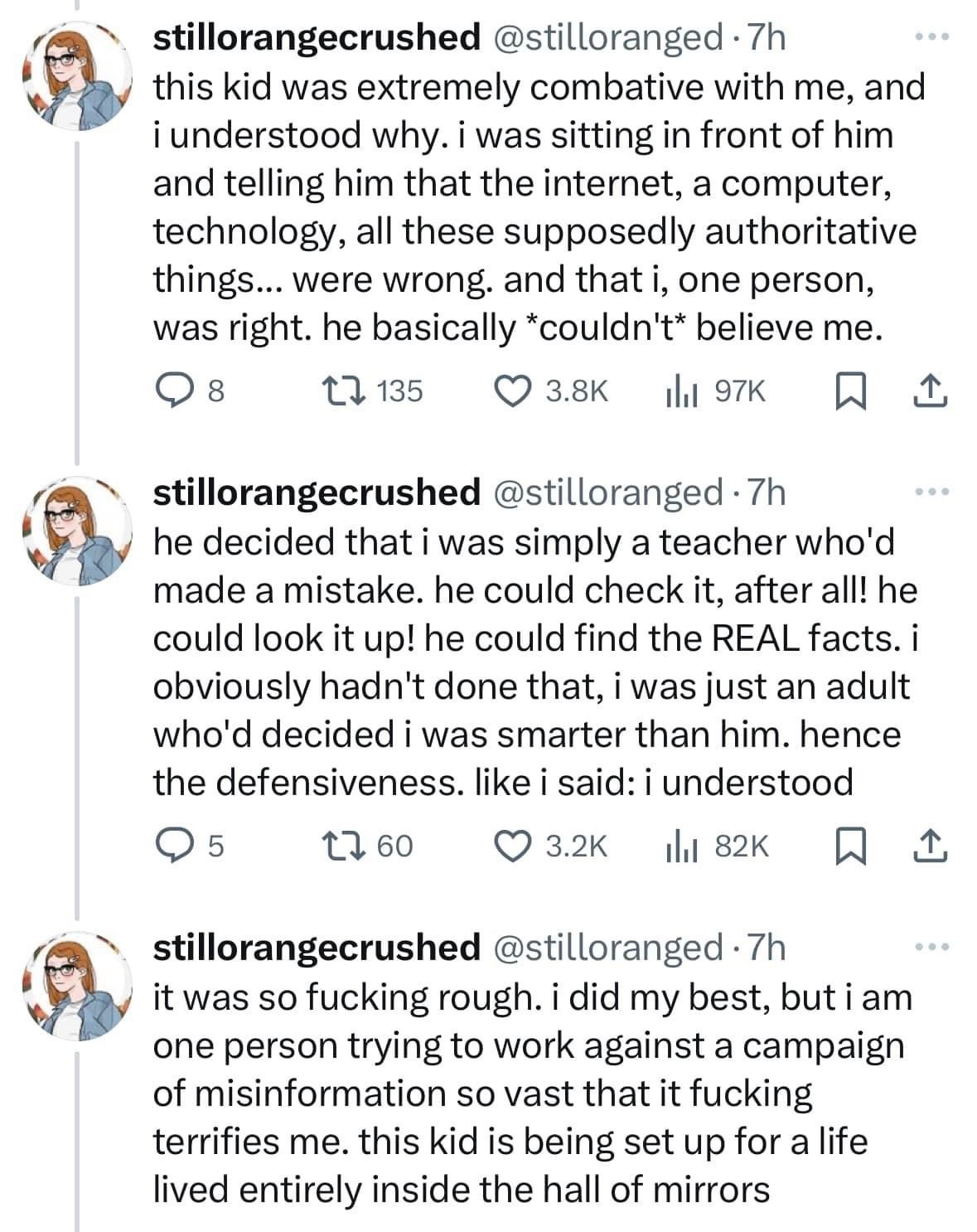 @stilloranged: this kid was extremely combative with me, and i understood why. i was sitting in front of him and telling him that the internet, a computer, technology, all these supposedly authoritative things... were wrong. and that i, one person, was right. he basically *couldn't* believe me. he decided that i was simply a teacher who'd made a mistake. he could check it, after all! he could look it up! he could find the REAL facts. i obviously hadn't done that, i was just an adult who'd decided i was smarter than him. hence the defensiveness. like i said: i understood. it was so fucking rough. i did my best, but i am one person trying to work against a campaign of misinformation so vast that it fucking terrifies me. this kid is being set up for a life lived entirely inside the hall of mirrors