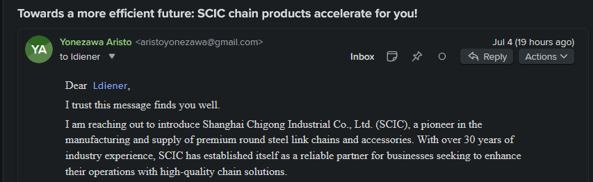 "Towards a more efficient future: SCIC chain products accelerate for you!" "Dear Ldiener, I trust this message finds you well. I am reaching out to introduce Shanghai Chigong Industrial Co., Ltd. (SCIC), a pioneer in the manufacturing and supply of premium round steel link chains and accessories. With over 30 years of industry experience, SCIC has established itself as a reliable partner for businesses seeking to enhance their operations with high-quality chain solutions."