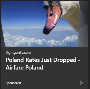 " Poland Rates Just Dropped - Airfare Poland", illustrated by a goose or duck or whatever looking angrily into a plane