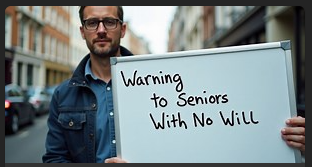 man holding a sign that says "Warning to Seniors with No Will"