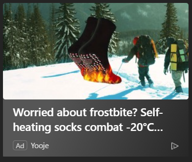 "Worried about frostbite? Self-heating socks combat -20°C", illusrated with an image of socks that are ON FIRE
