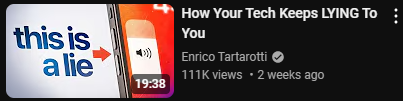 some youtubers "HOW YOUR TECH KEEPS LYING TO YOU" video, thumbnail has an arrow that points to volume slider on a phone with text saying "THIS IS A LIE"