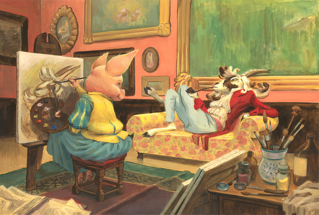 Illustration of a pig painting a portrait of a goat.