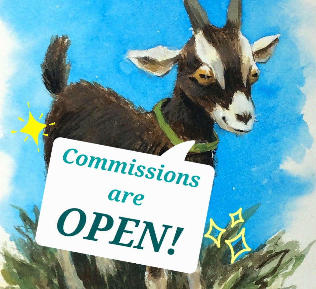 Painting of a goat in gouache with a speech bubble that says "Commissions are open!"