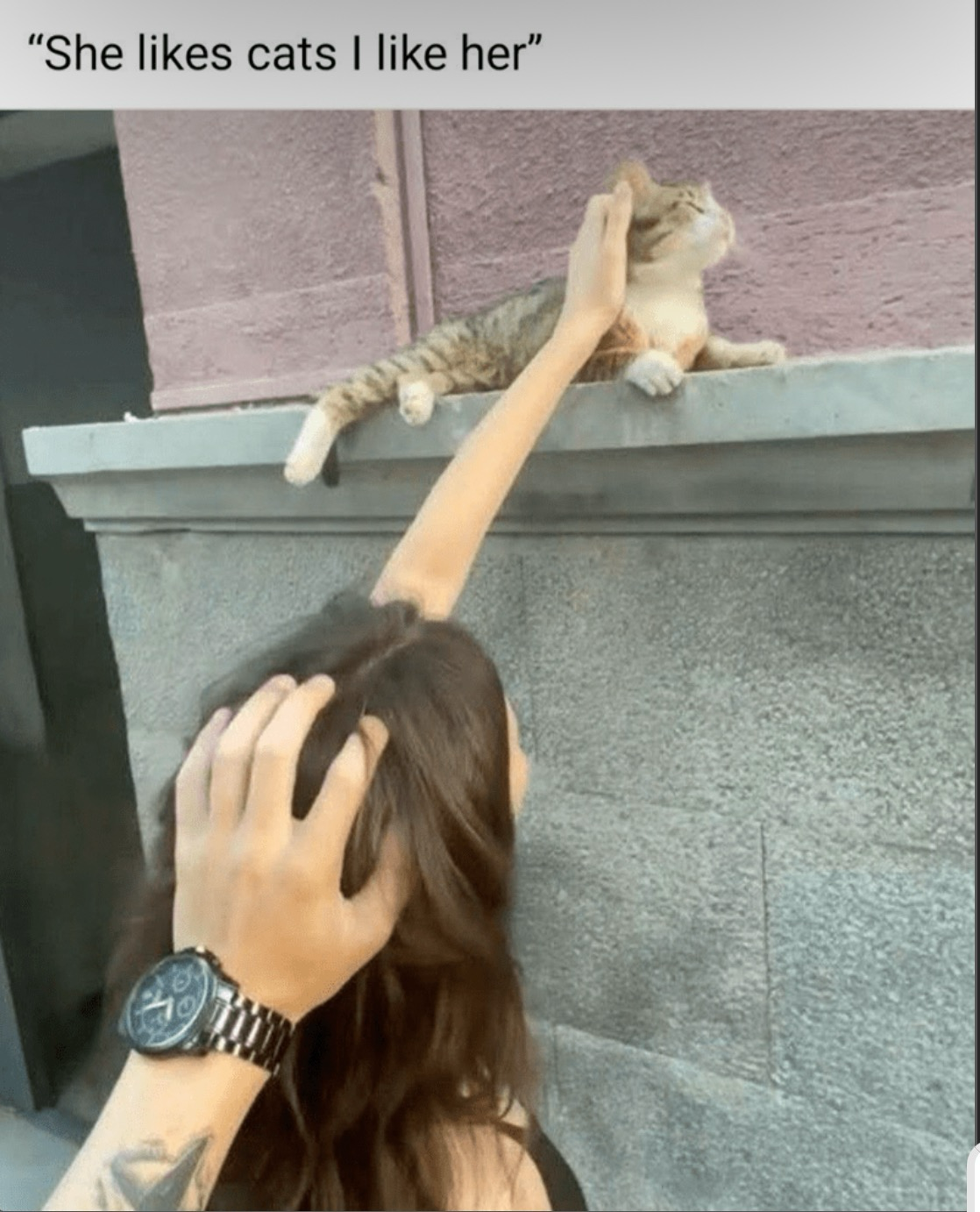 A woman extends a hand and arm upward to stroke a tiger cat lying in the sun. A hand is reaching into the frame to pat her own head. Captioned: "She likes cats I like her".