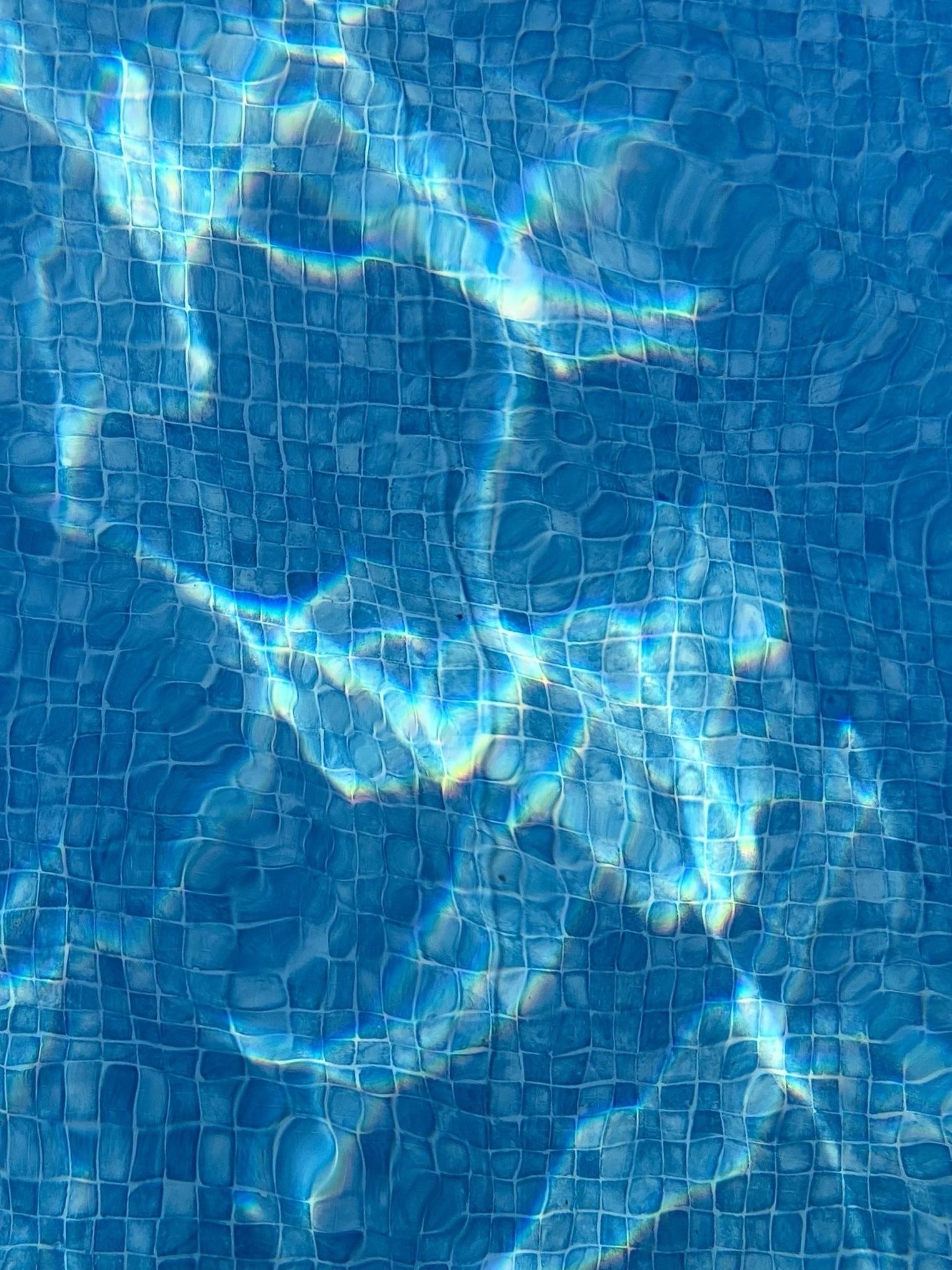 Light caustics in a pool, bright ribbons of fluctuating light, with a distorted blue tile pattern at the bottom.