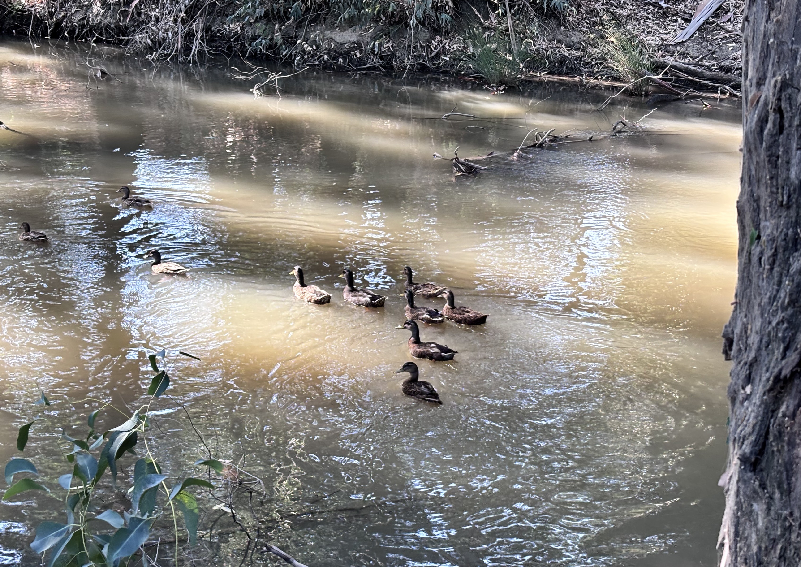 A group of ducks swimming in a shallow, muddy river surrounded by trees and vegetation.