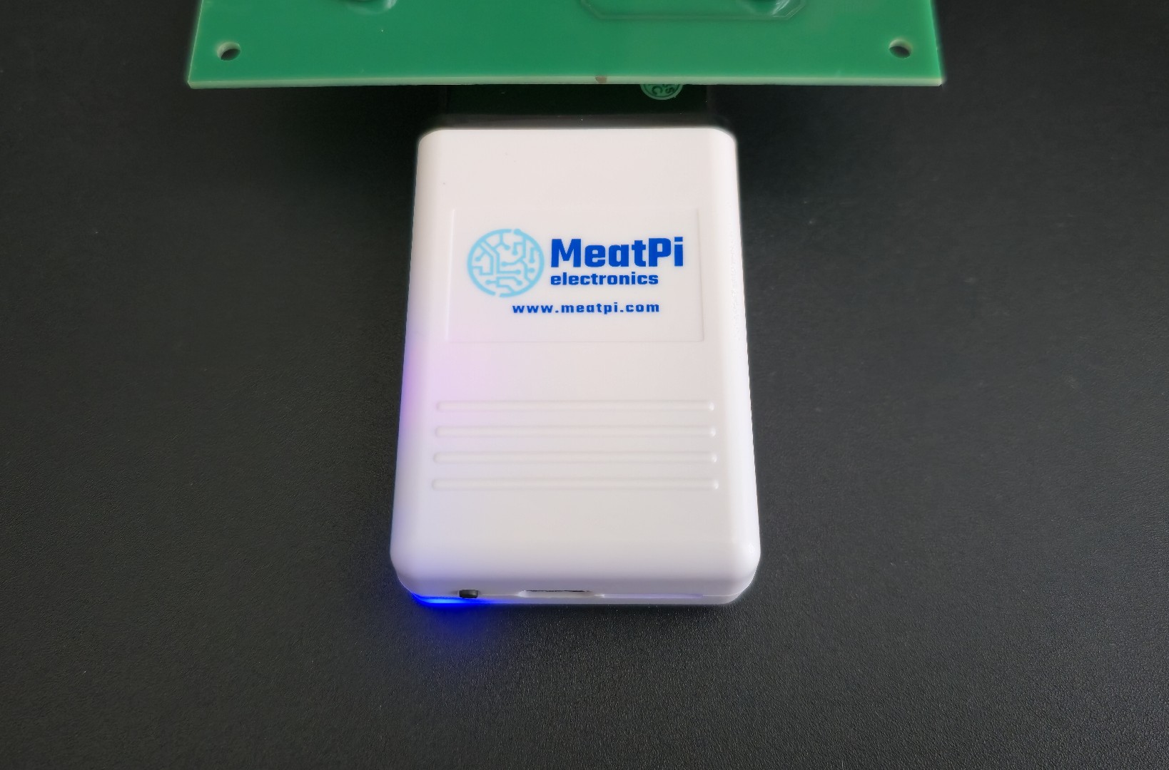 MeatPi Electronics auto diagnostic tool WiCAN PRO running plugged into OBD-2 simulator, with blue light on left bottom corner shining