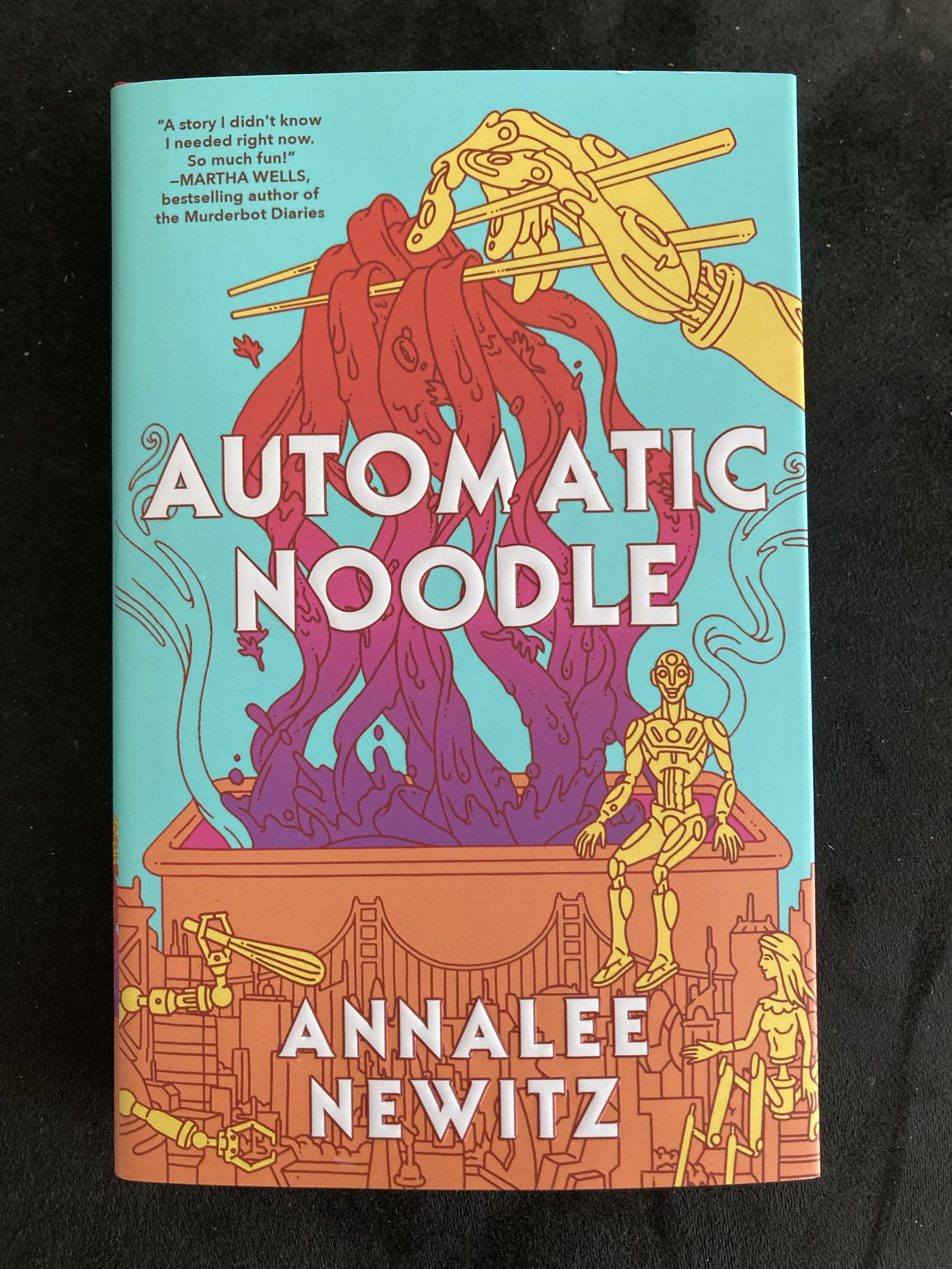 A photo of the dust jacket of a new novel titled Automatic Noodle. The cover shows several yellow robots preparing and eating a giant bowl of red noodles.