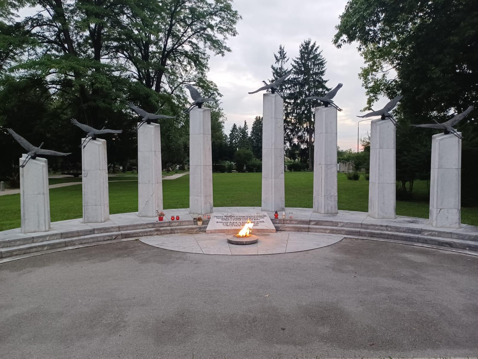Eternal flame memorial to the Soviet soldiers killed in World War Two, in Ljubljana city cemetery. A sculpture with birds flying, while an eternal real flame burns on the ground.
