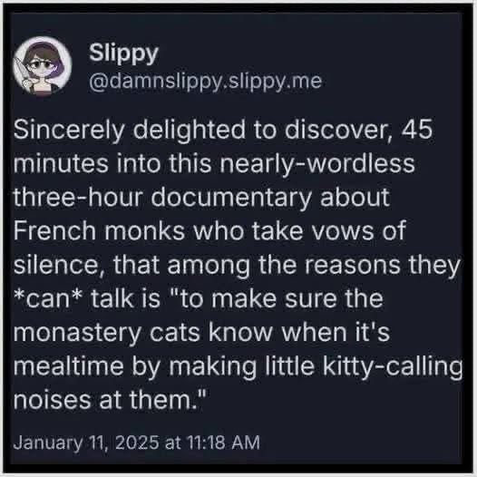 Slippy @damnslippy.slippy.me Sincerely delighted to discover, 45 minutes into this nearly-wordless three-hour documentary about French monks who take vows of silence, that among the reasons they *can* talk is "to make sure the monastery cats know when it's mealtime by making little kitty-calling noises at them."