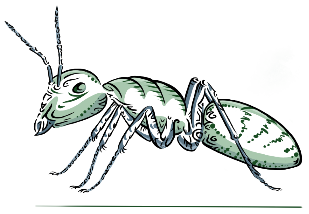 Drawing of an ant from left side, zoomed closely. Its contour lines are thick and black, with some curved lined and dot patterns nearby. Shading is made of two bright shades of pale grayish green.