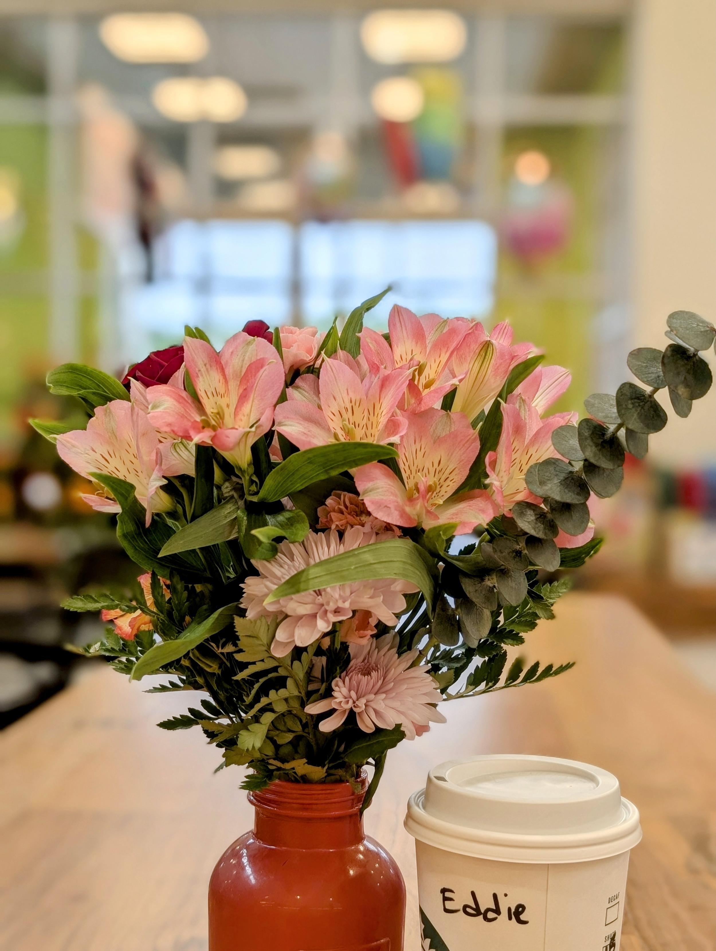 a small bottle urn with an arrangement of Peruvian lilies, mums, dried eucalyptus and fern sits on a long wooden table next to a carry-out coffee cup. The background is out of focus. store interior, large double-height windows to the outside and the rainy afternoon.