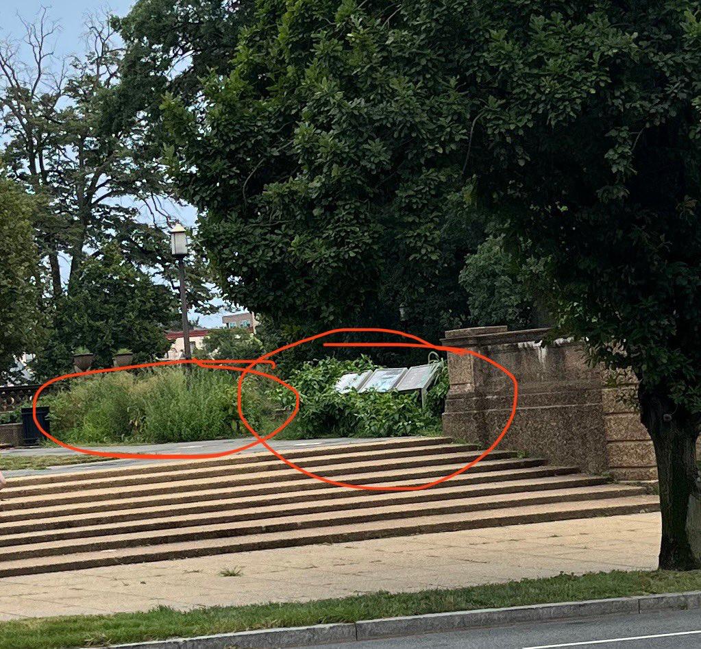 Overgrown weeds at Median Hill Park in Washington, DC, which is technically owned by the National Park Service. Image from Popville: https://www.popville.com/2025/08/the-weeds-are-so-tall-they-almost-cover-the-signs/