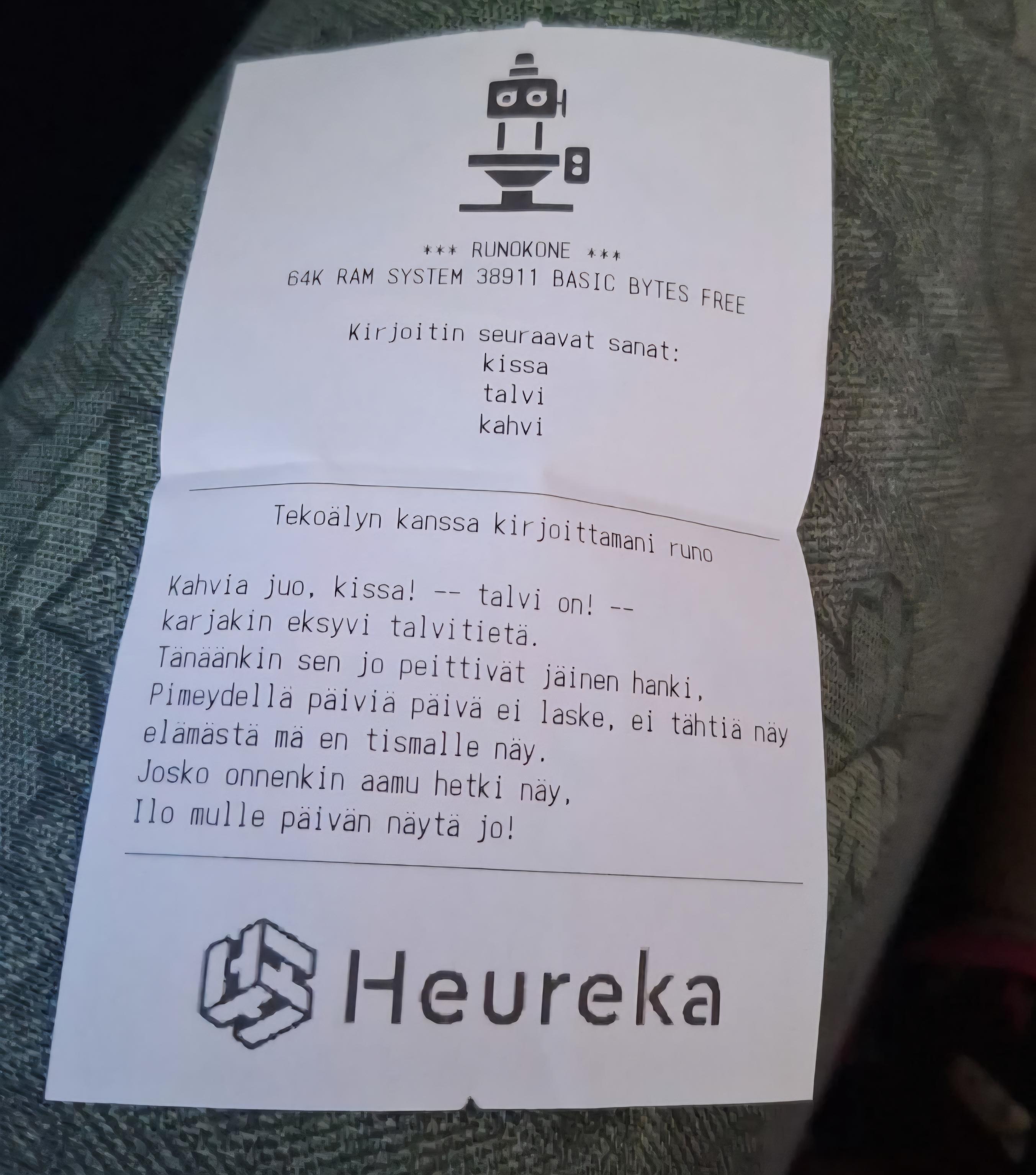 Kuva kuitista, jossa Heureka tekoÀlyn kanssa kirjoitettu runo, annettu sanat kissa, talvi ja kahvi: "Kahvia juo, kissa! Talvi on! Karjakin eksyvi talvitieltÀ. TÀnÀÀnkin sen jo peittivÀt jÀinen hanki. PimeydellÀ pÀiviÀ pÀivÀ ei laske, ei tÀhtiÀ nÀy elÀmÀstÀ mÀ en tismalle nÀy. Josko onnenkin aamu hetki nÀy. Ilo mulle pÀivÀn nÀytÀ jo!"