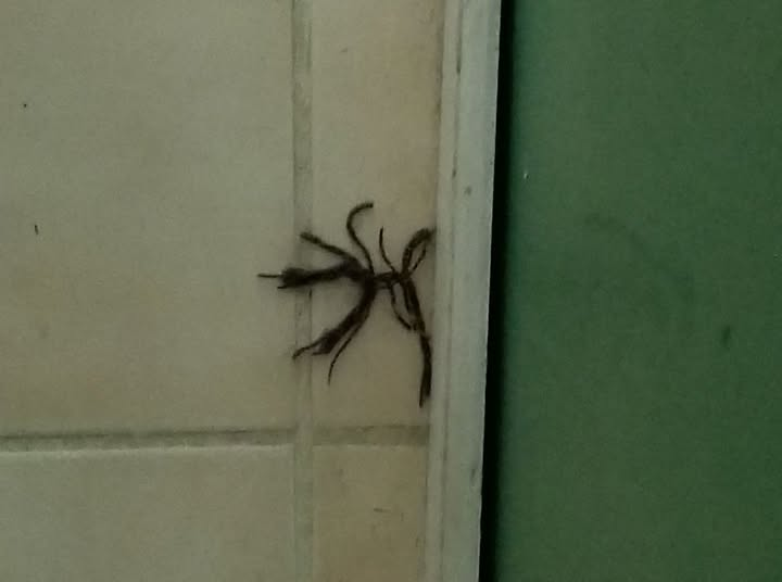 A very spider looking piece of a shredded dog toy, on beige tile, near a green wall.