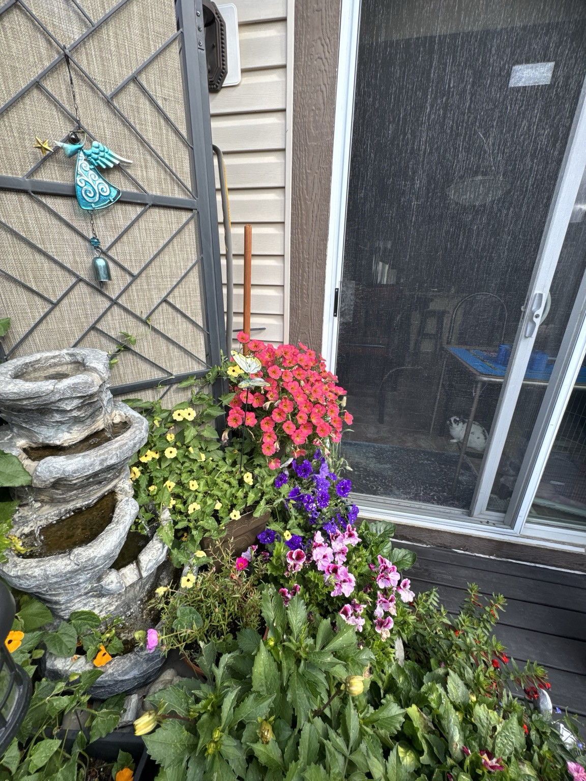 Bunny peers through a screen door outside. Photo taken from behind some flowers and a fountain
