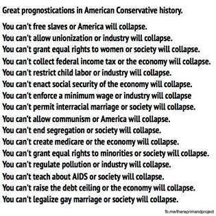 Great prognostications in American Conservative history. You can't free slaves or America will collapse. You can't allow unionization of industry will collapse. You can't grant equal rights to women or society will collapse. You can't collect federal income tax o the economy will collapse. You can't restrict child labor or industry will collapse. You can't enact social security of the economy will collapse. You can't enforce a minimum wage or industry will collapse. You can't permit interracial marriage or society will collapse. You can't allow communism or America will collapse. You can't end segregation or society will collapse. You can't create Medicare or the economy will collapse. You can't grant equal rights to minorities or society will collapse. You can't regulate pollution or industry will collapse. You can' teach about AIDS or society will collapse. You can't raise the debt ceiling or the economy will collapse. You can't legalize gay marriage or society will collapse.