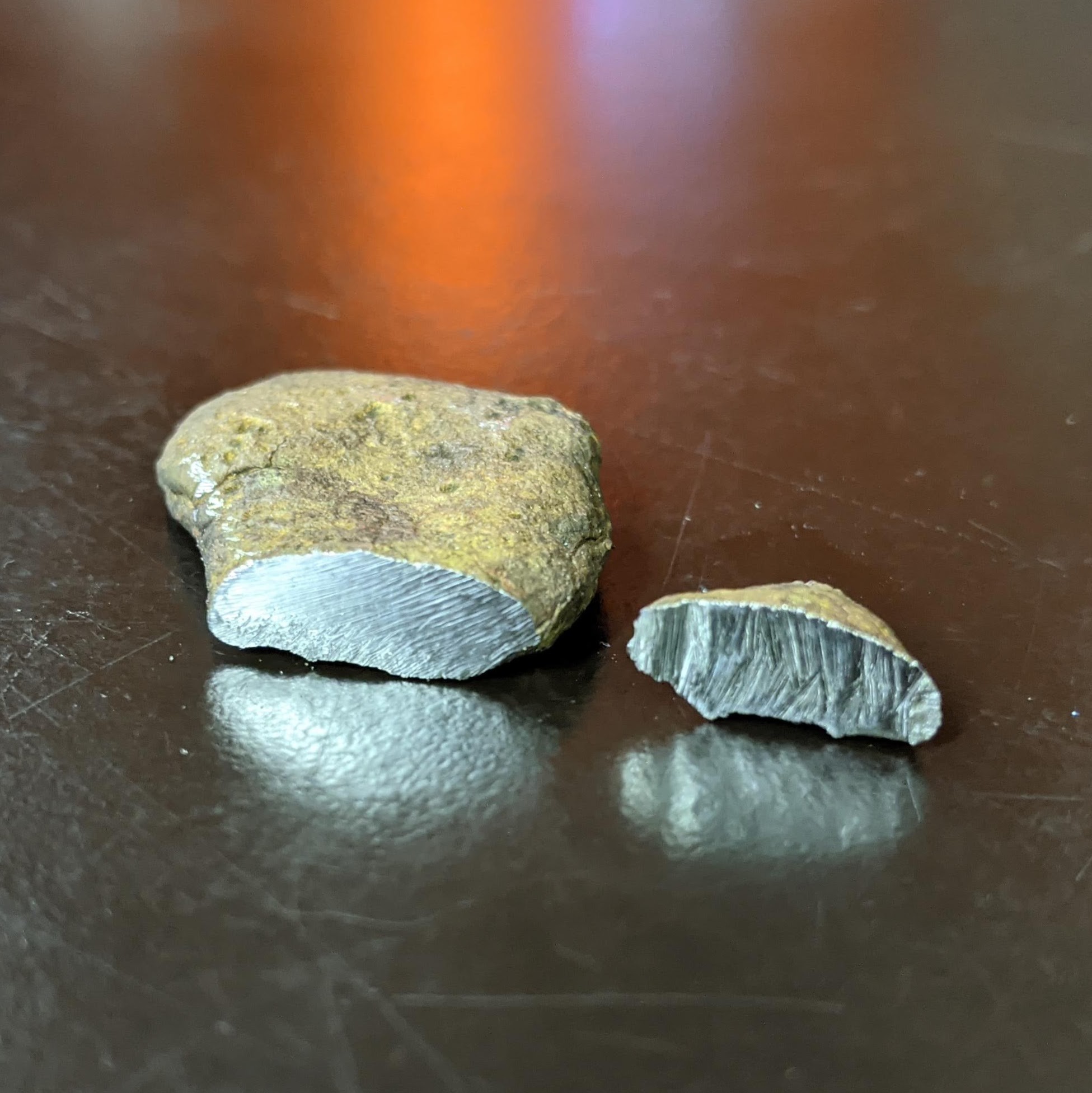 A closeup of the ingot with a piece sawn off. The cut face has a slightly golden colour.