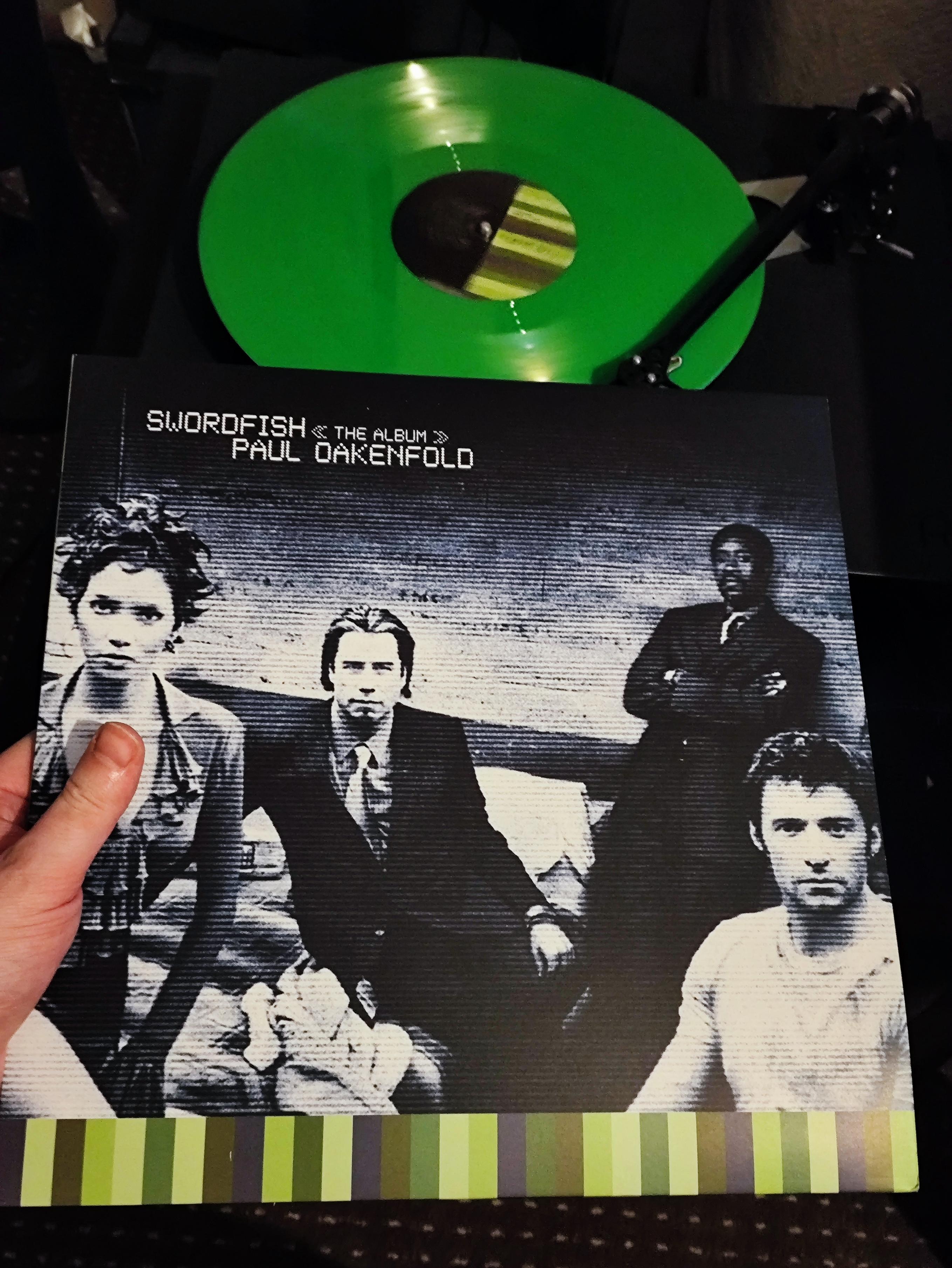The cover to the film Swordfish with Don Cheadle standing at the back, Halle Berry sat on a table left in the foreground. Hugh jackman sat on the right and John Travolta in the middle