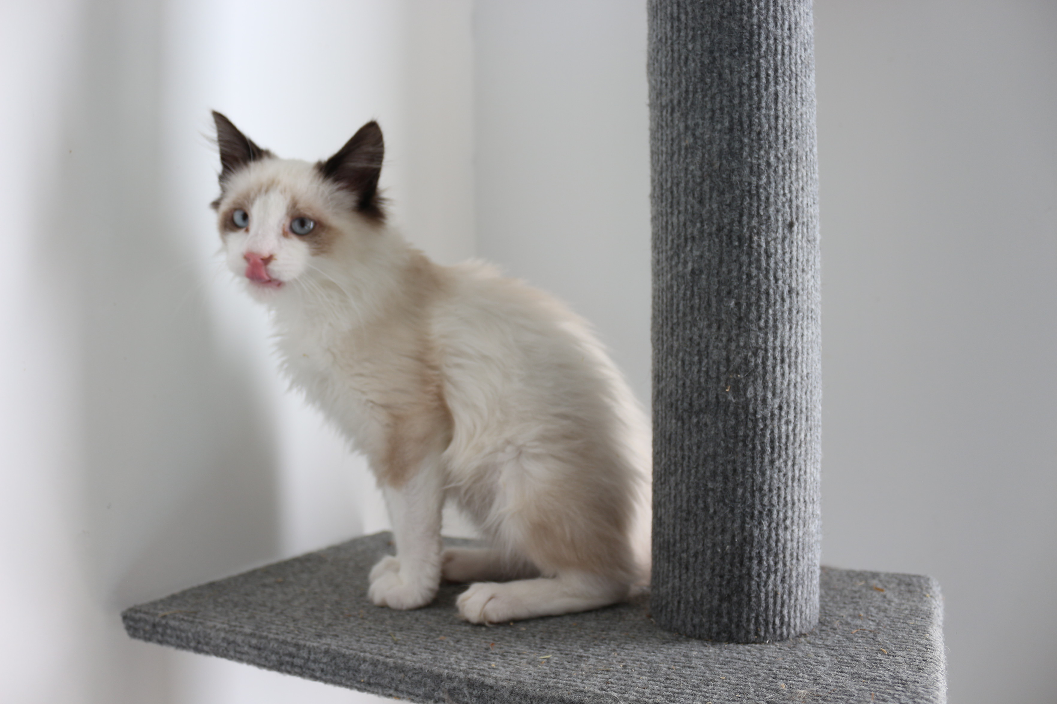 Goblin Chantilly, une chatonne seal point et blanche à poils longs, aux yeux bleus clairs et au nez rose, assise sur la plateforme d'un arbre à chat, en train de se lécher le nez. Elle est très jolie ; ses yeux sont un peu écartés l'un de l'autre.