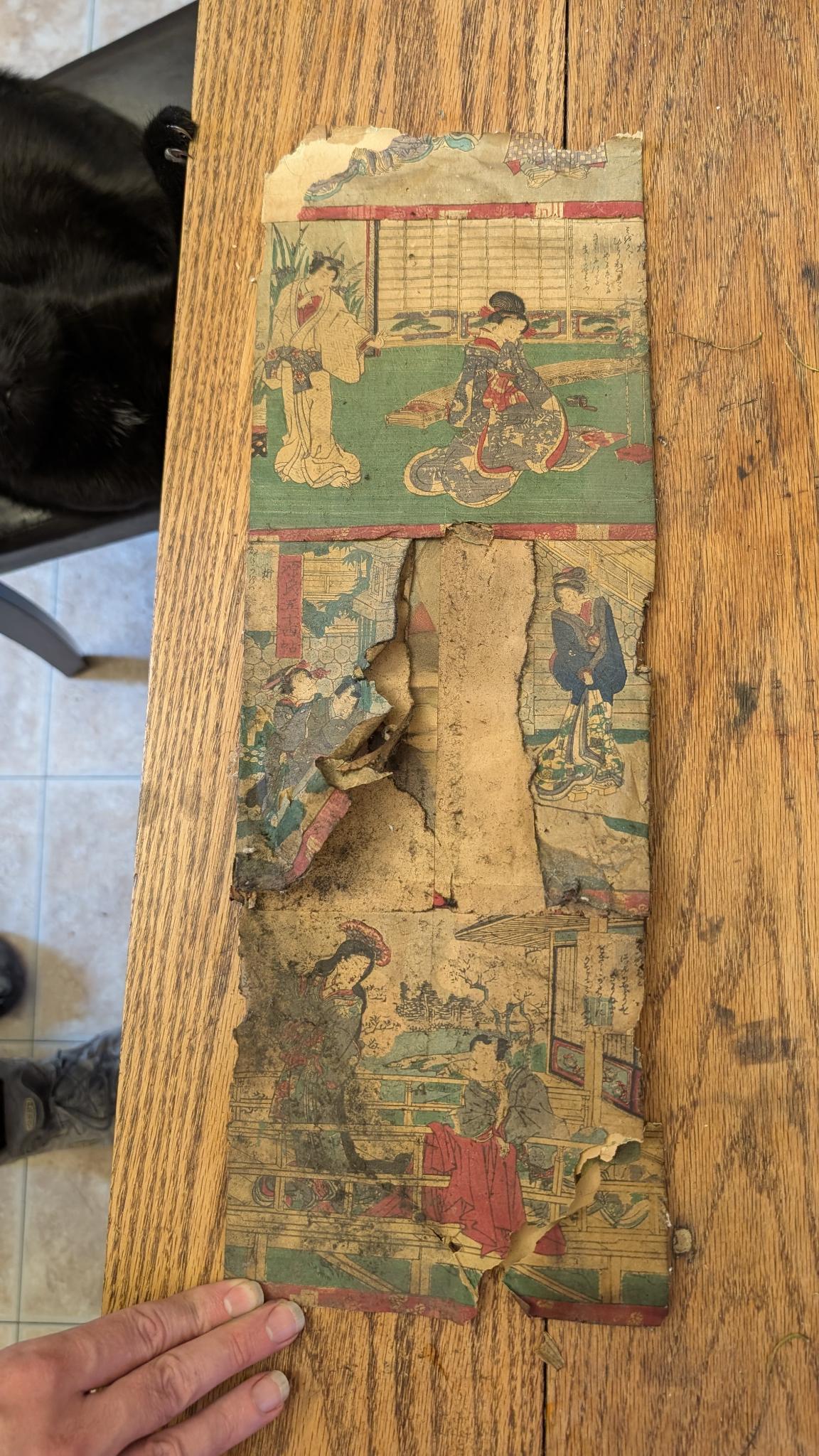 A very yellow and eaten parchment sits on a wooden table. You can see traditional Japanese style images and some very small text. The middle is torn, missing and the whole thing looks very fragile. A hand is holding down it's curling lower edge.