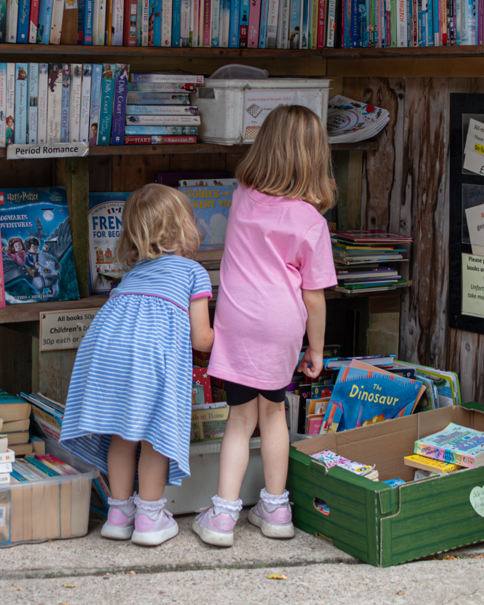 Two little girls, one dressed in pink and one in blue, are inspecting the books at our village Book Shed. They love picking out new books here. The books have been donated to be sold for charity.