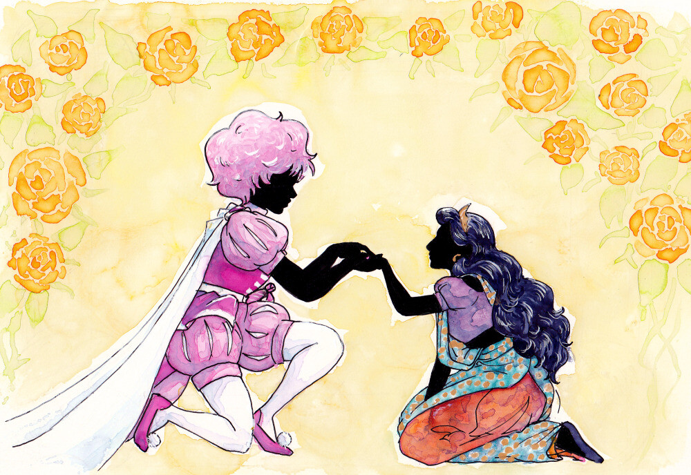 Pink Diamond and Connie Maheswaran, drawn in the style of Dios and Utena in the shadow play flashback when Dios gives Utena the ring