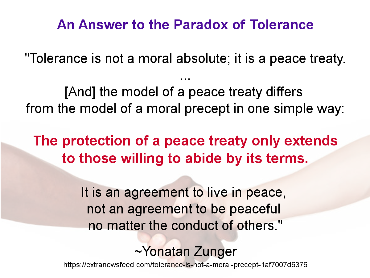 Meme with text: An Answer to the Paradox of Tolerance "Tolerance is not a moral absolute; it is a peace treaty. ... [And] the model of a peace treaty differs from the model of a moral precept in one simple way: the protection of a peace treaty only extends to those willing to abide by its terms. It is an agreement to live in peace, not an agreement to be peaceful no matter the conduct of others." ~Yonatan Zunger https://extranewsfeed.com/tolerance-is-not-a-moral-precept-1af7007d6376