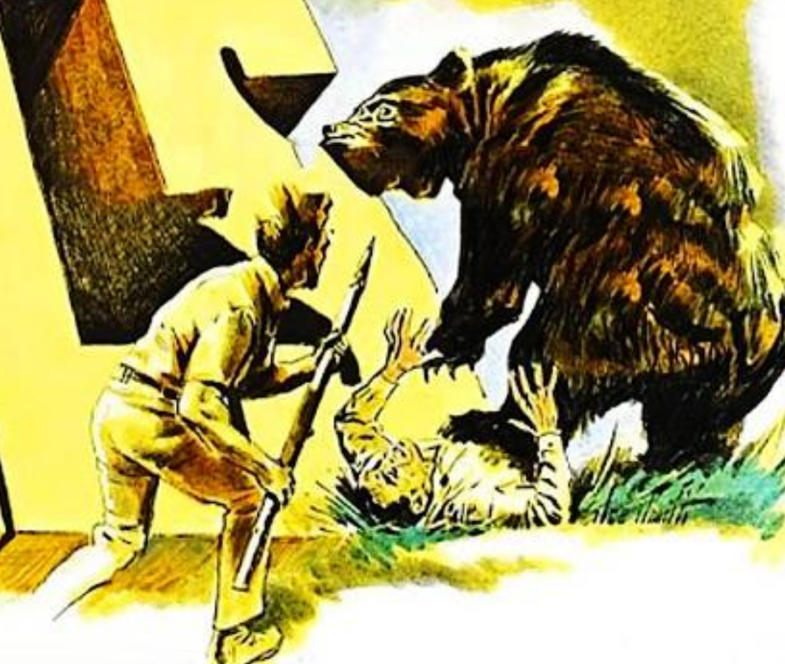 Close-up of two men fighting a bear