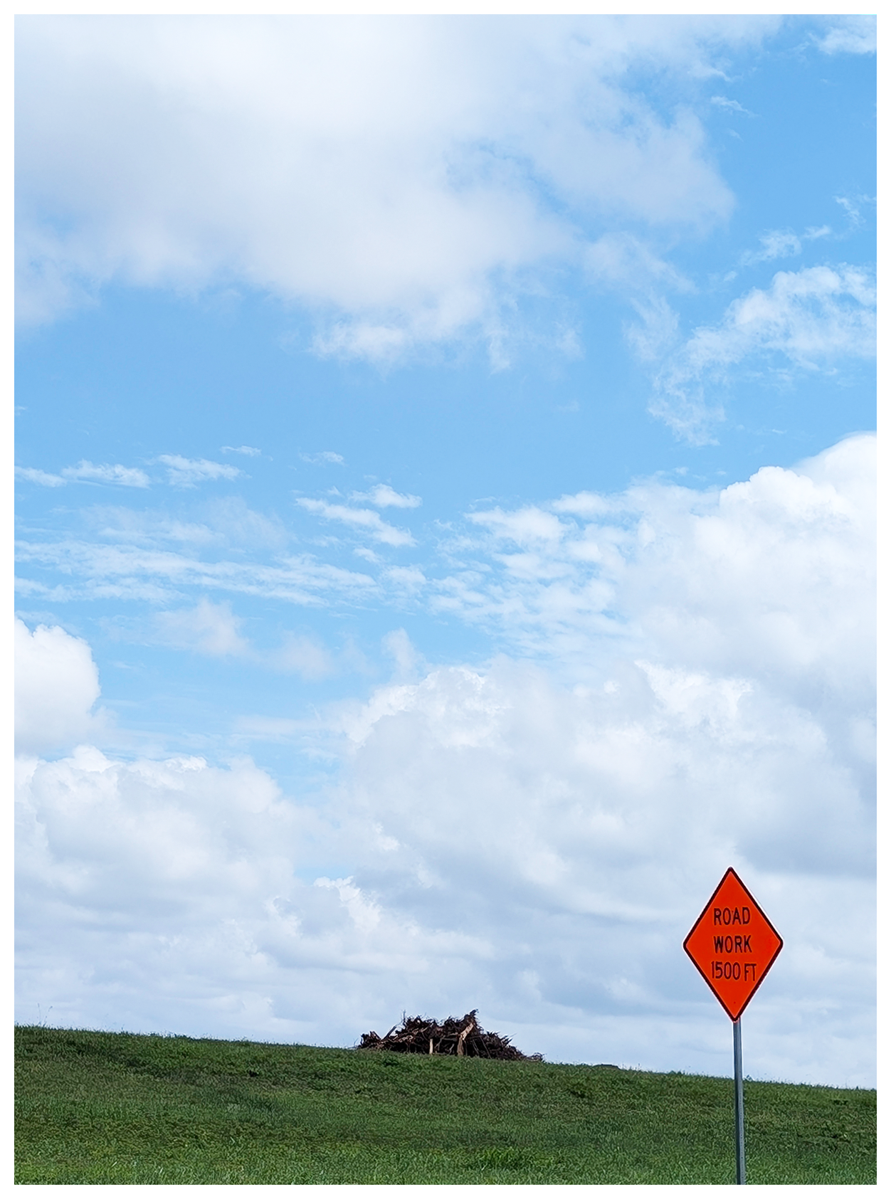 ai-assisted alt text: A bright orange Road Work 1500 FT sign stands on green grass under a mostly blue sky with scattered clouds. In the distance, theres a small pile of felled tree branches on the grass near the horizon.