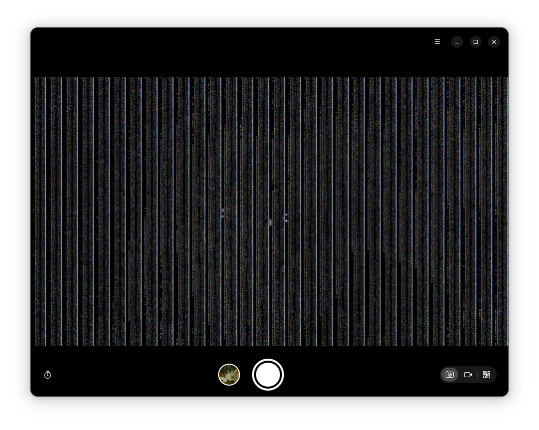screenshot of Snapshot, showing the camera feed - the image is glitches, showing rows of white bars followed by colourful fuzz