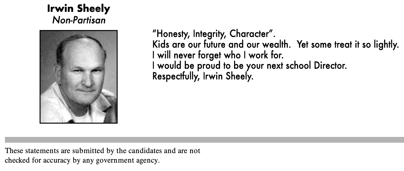 Irwin Sheely Non-Partisan βHonesty, Integrity, Characterβ. ; Kids are our future and our wealth. Yet some treat it so lightly. he | will never forget who | work for. - | would be proud to be your next school Director. J Respecifully, Irwin Sheely. These statements are submitted by the candidates and are not checked for accuracy by any government agency.