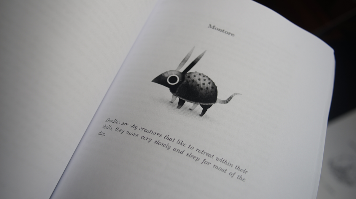 The inside of the book with a chapter head reading "Montore" and featuring a made up creature that looks like a cross between turtle and a rabbit