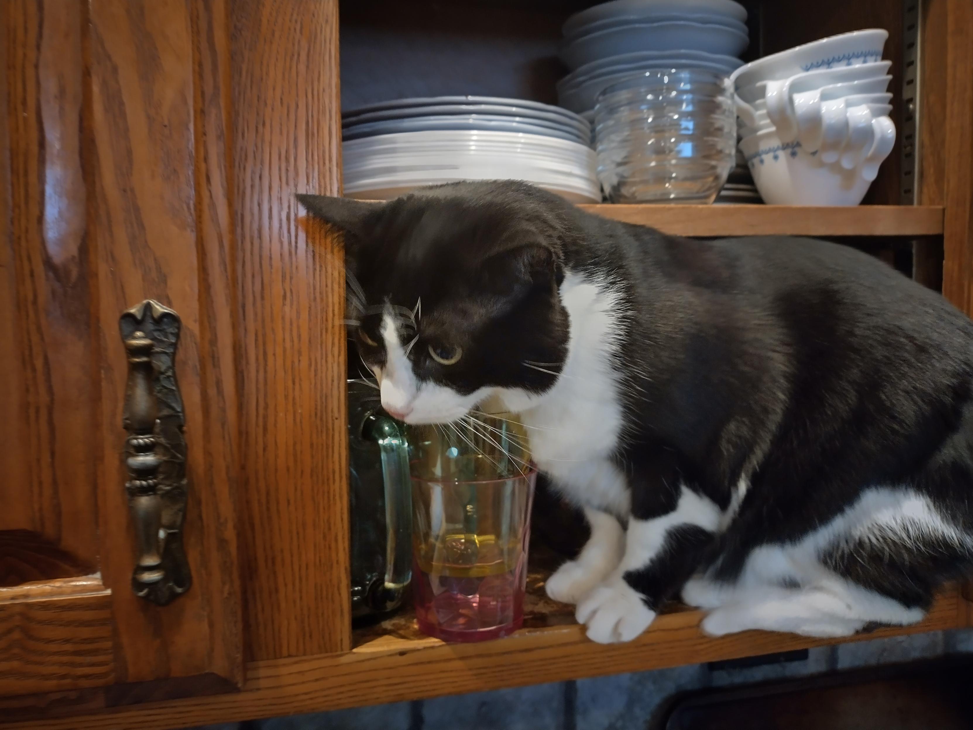 A cat sitting awkwardly in a cabinet of dishes