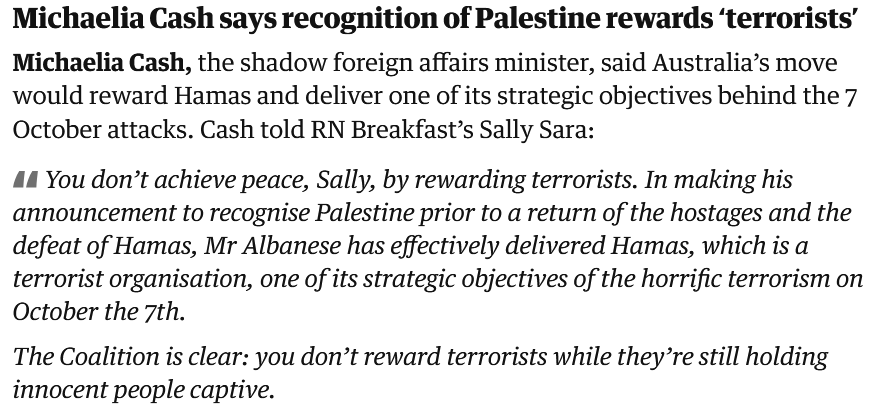 A screenshot from The Guardian liveblog: Michaelia Cash says recognition of Palestine rewards ‘terrorists’ Michaelia Cash, the shadow foreign affairs minister, said Australia’s move would reward Hamas and deliver one of its strategic objectives behind the 7 October attacks. Cash told RN Breakfast’s Sally Sara: "You don’t achieve peace, Sally, by rewarding terrorists. In making his announcement to recognise Palestine prior to a return of the hostages and the defeat of Hamas, Mr Albanese has effectively delivered Hamas, which is a terrorist organisation, one of its strategic objectives of the horrific terrorism on October the 7th. The Coalition is clear: you don’t reward terrorists while they’re still holding innocent people captive."