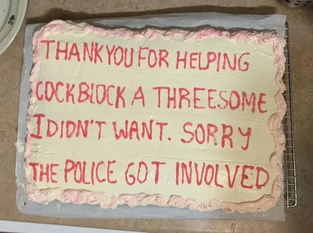 The image shows a rectangular cake with white frosting and red lettering. The cake is sitting on a metal cooling rack, which is placed on a surface that appears to be a countertop. The cake is decorated with pink frosting along the edges in a wavy design. The red lettering on the cake reads, "THANK YOU FOR HELPING COCKBLOCK A THREESOME I DIDN'T WANT. SORRY THE POLICE GOT INVOLVED." The lettering is somewhat uneven, suggesting it was written by hand. The composition is a close-up shot, focusing on the cake and its message. The color palette consists primarily of white, pink, and red, with the background providing a muted brown tone. There is a plate with a blue floral pattern visible in the top left corner.